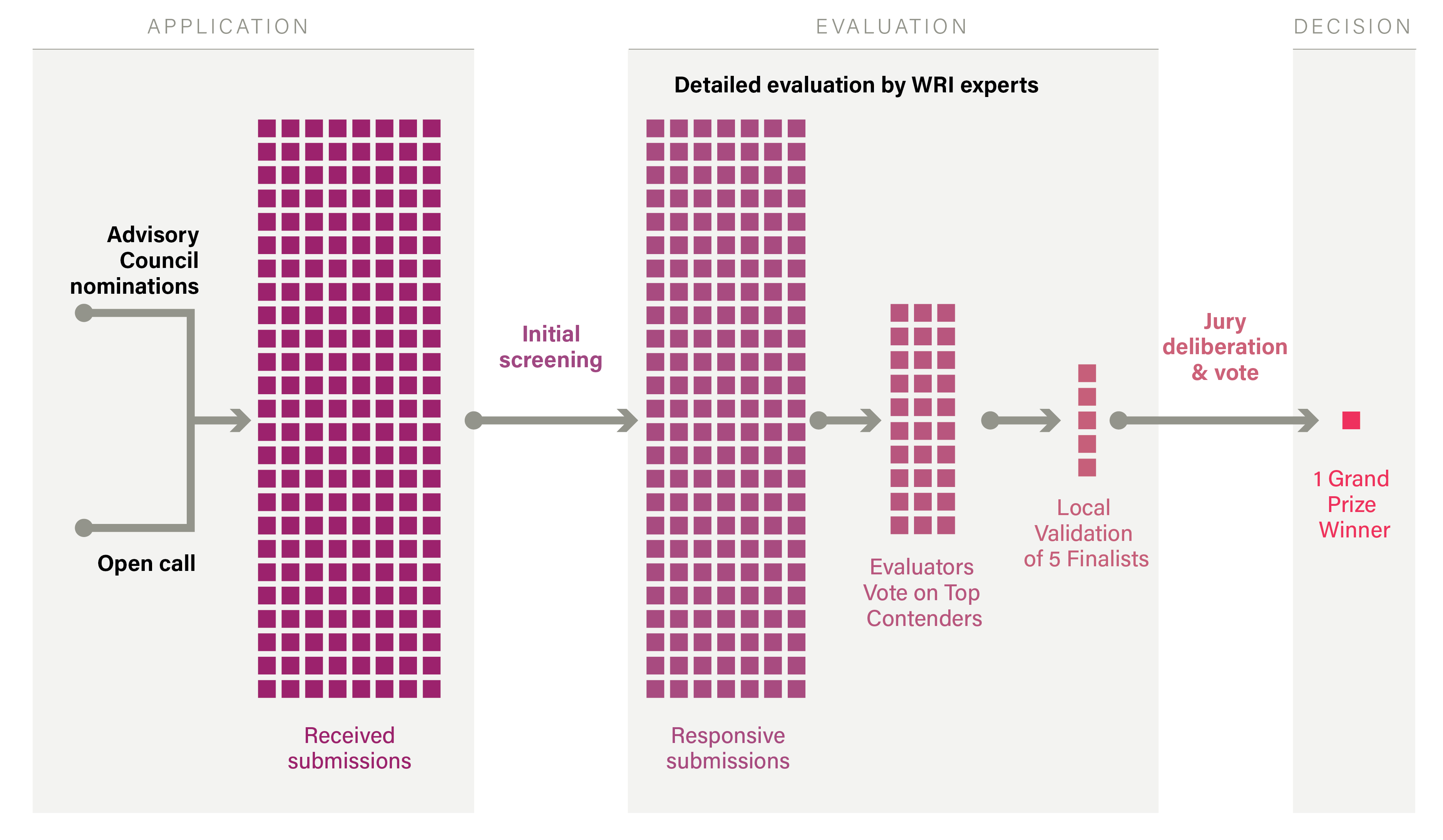 Responsive submissions are passed on to an evaluation team of WRI’s global experts. Evaluators apply criteria and a rating scale according to evidence of big ideas, deep impact, and ripple effects that extend to the entire city and beyond. Evaluators also apply a qualitative lens to assess submissions based on their responsiveness to the cycle’s theme. The methodology was developed specifically for the WRI Ross Center Prize for Cities.
